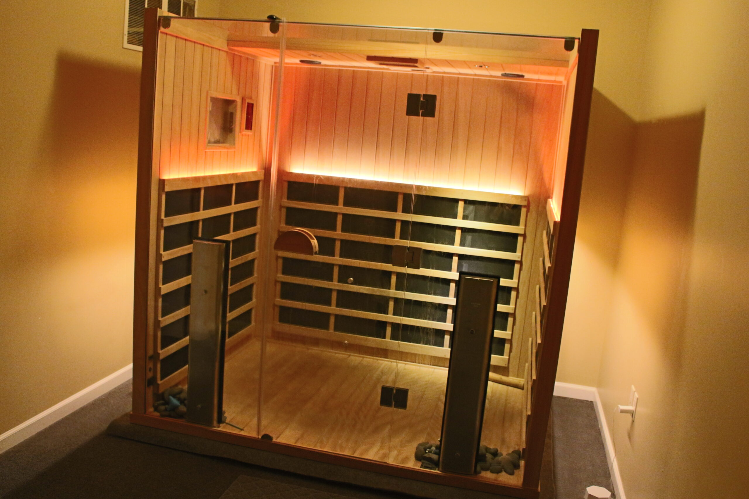 Removable benches that effortlessly create an open and inviting interior. Note: My benches have never been used inside a sauna as our sauna is used for hot yoga and stretching. Embrace the freedom to stretch, exercise, or simply bask in the serene atmosphere within the sauna. The powerful carbon-ceramic far-infrared heaters combined with the two 500 watt full spectrum heaters on the front glass envelop you in therapeutic warmth, promoting relaxation and detoxification.